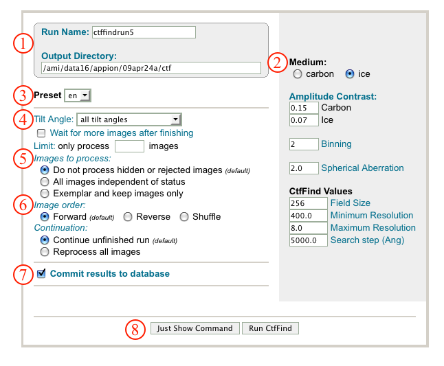 - Radio buttons under "Image Order" sets the order in which images are processed and radio buttons under "Continuation" gives the option of continuing or rerunning a previous CtfFind run.