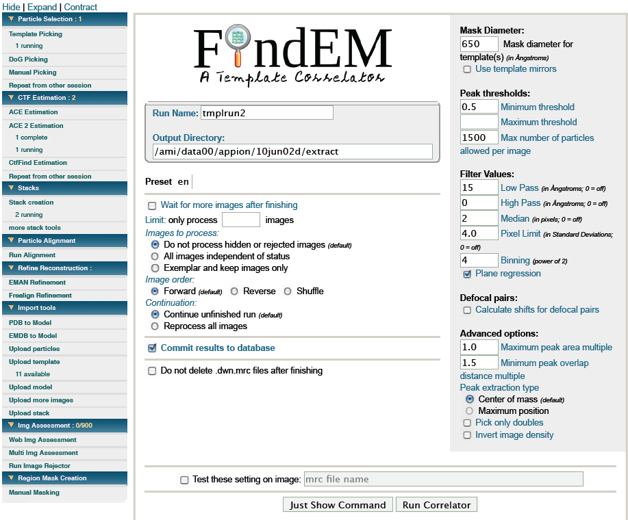 - Test first then submit: Choose a mask diameter (if you have no idea make it big) and play around with the different parameters (simply paste the filename of a typical image in the test settings box). It is a good idea to optimize the settings on one image and then test a second image. Don't worry about the final boxsize or binning this will be determined in the next step: stacks !