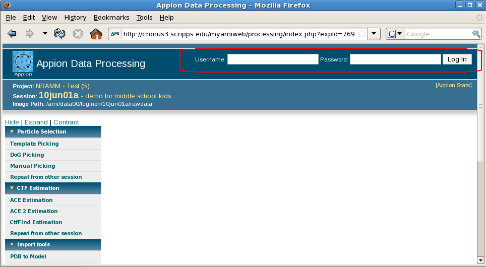 - When you open the Appion Data Processing interface, notice the Username and Password fields in the upper right corner of the screen.