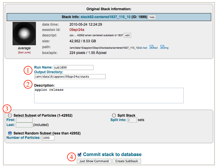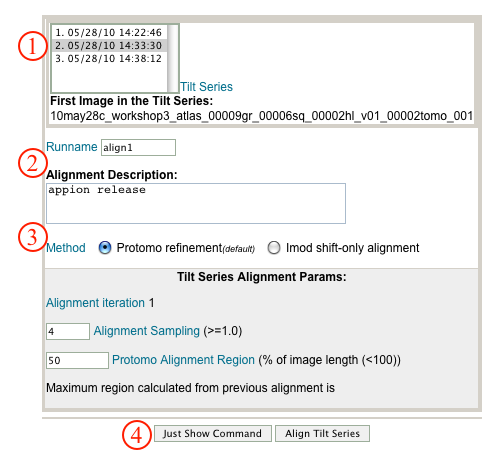 - Click "Align Tilt Series" to submit to the cluster. Alternatively, click "Just Show Command," to copy and paste the command into a unix shell.