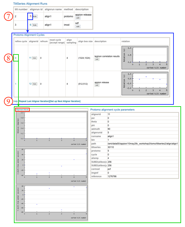 - Clicking on the "refine cycle" number opens a report page for that cycle including input parameters and directory paths. Clicking on "Alignment Movie" opens a new web-browser with a movie of the aligned tilt series.