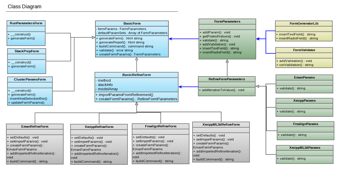 The following class diagram shows the BasicForm class with it's extended classes as well as the FormParameter class and it's extended classes. It also shows associations among the classes. Notice that the specific refine parameter classes use polymorphism to override the validate() function. This allows the extended classes to provide more complex validations than a typical form requires. Other forms, such as RunParameters and stack prep, just use the base FormParameters class that their parent, BasicForm, uses.