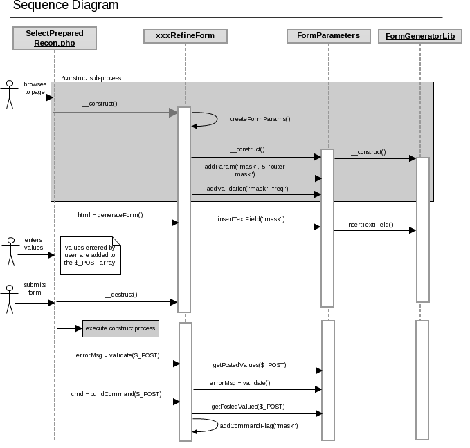 The following sequence diagram shows how the Form and Parameter classes work together to display a form, validate the user input, and create a command string.