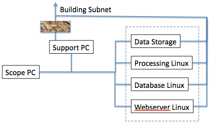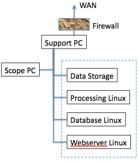 Some of the FEI microscopes come with a "support PC" which acts as gateway to the scope PC and prevents the latter direct internet access. The easiest set up is then put the Leginon system within that local network. This has the drawback that Leginon web viewing as well as the data collected are only accessible in the local network (typically in the same room).