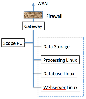 At NRAMM, our microscope, Leginon processing server, Database server, and Webserver are all within the same and reliable firewall provided by its gateway. We turn off the Windows firewall on the scope PC in this case. The assumption used in this configuration is that computers within the bound of the gateway is safe. This allows all computers in the lab access to the data collected.