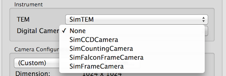Instrument Selection Panel is used to choose the TEM and Digital Camera used for imaging. It can be found in Settings Dialog of nodes with direct control such as Correction Node, as well as Edit Preset Dialog in Presets Manager.