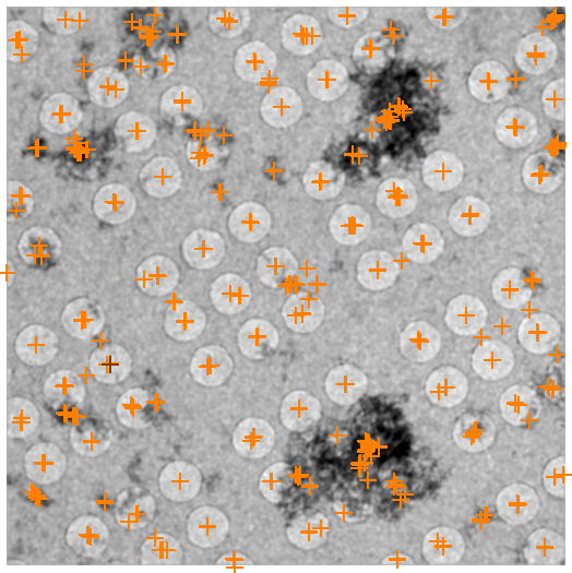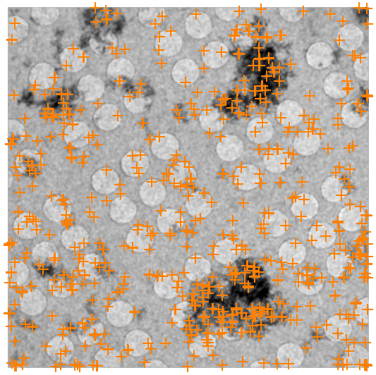 Example of a bad feature finding: Even though the number of features are in the hundreds, the obvious features are not found because both Min and Max Feature Sizes are set too small. As a results, most features are lost after tilting (2nd panel) and unrelated features are found instead.