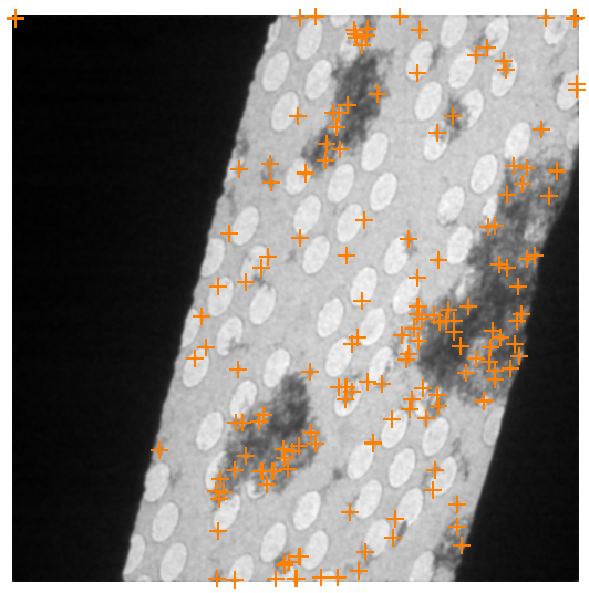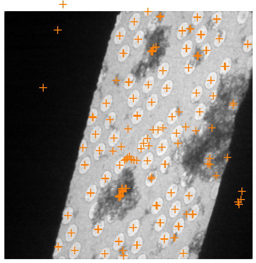 Example of a good feature finding: There are good number of features. In addition, the obvious features, the center of most holes in the 3x3 hole patterns are identified. As a result, many of the features can be consistently identified after the distorting of tilting.