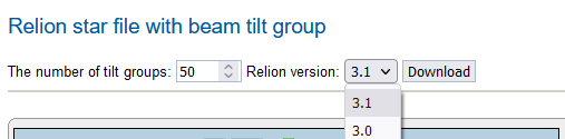 Here you can set the number of tilt groups and choose from a drop down menu the output format (Relion version 3.1 or 3.0). Click on Download button to download Relion star file with beam-image tilt X and Y values grouped into clusters with tilt-wrangler.