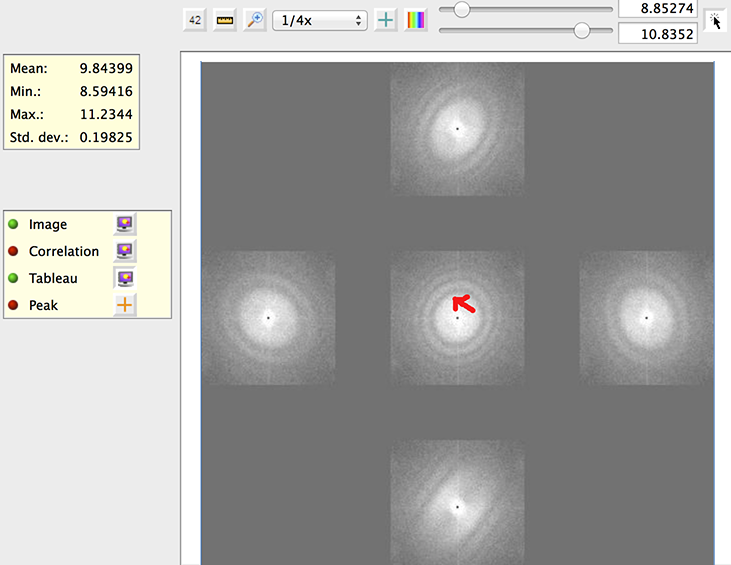 In the example below, the red arrow is where we would adjust the beam tilt to. This is because because the two tilted images in the x direction look similar, suggesting no average coma beam tilt in x. The tilt image at the top has less astigmatism than the one at the bottom. The magnitude of the correction needs some experience to gauge. It is clear, though, we do not want to adjust the beam tilt to as far as the mid point in this direction.